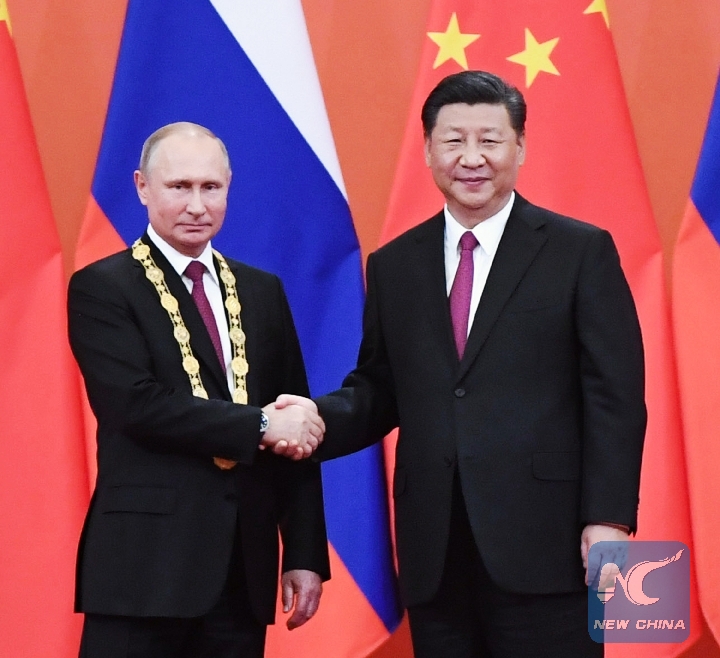 Chinese President Xi Jinping awards his Russian counterpart Vladimir Putin the first-ever Friendship Medal of the People's Republic of China at the Great Hall of the People in Beijing, capital of China, June 8, 2018. (Xinhua/Shen Hong)