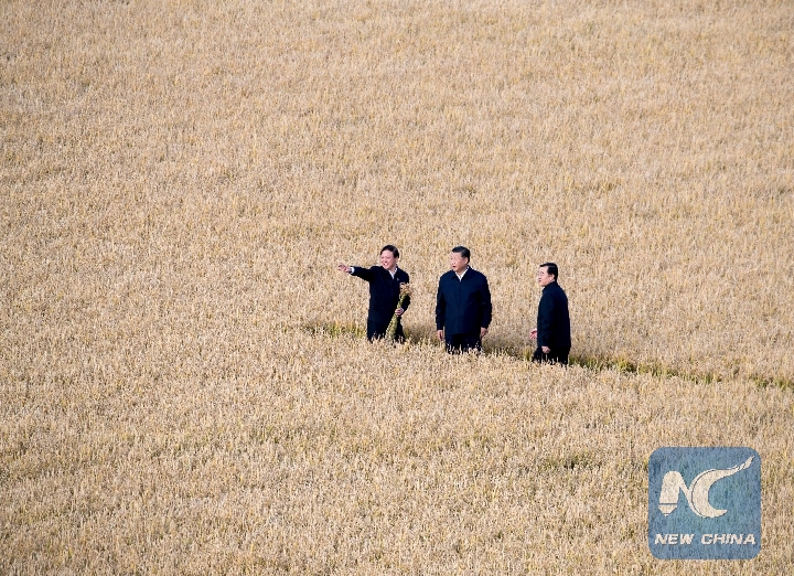Chinese President Xi Jinping (C), also general secretary of the Communist Party of China (CPC) Central Committee and chairman of the Central Military Commission, visits the farms and land reclamation administrative bureau of Jiansanjiang, northeast China's Heilongjiang Province, Sept. 25, 2018. (Xinhua/Wang Ye)