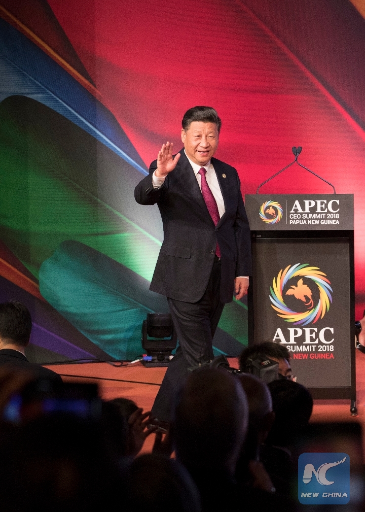 Chinese President Xi Jinping enters the venue of the Asia Pacific Economic Cooperation (APEC) CEO Summit in Port Moresby, Papua New Guinea, on Nov. 17, 2018. Xi delivered a keynote speech titled Jointly Charting a Course Toward a Brighter Future at the summit. (Xinhua/Huang Jingwen)