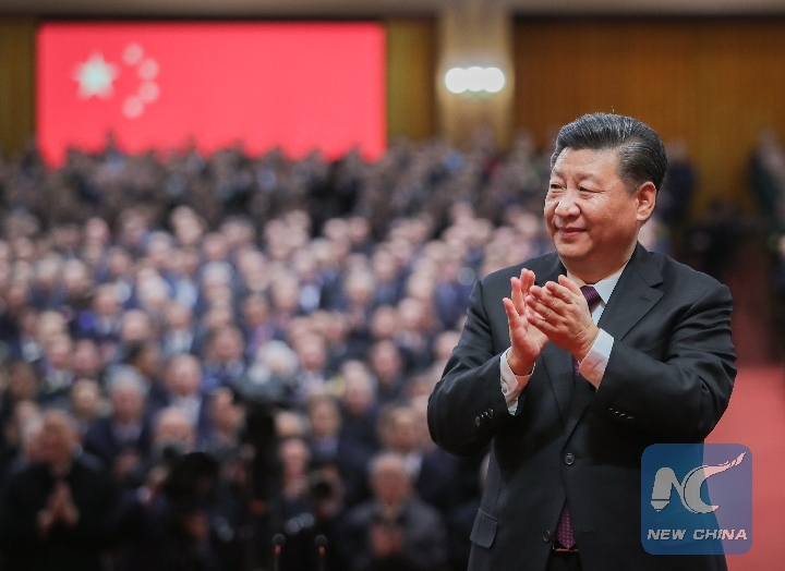 Chinese President Xi Jinping, also general secretary of the Communist Party of China (CPC) Central Committee and chairman of the Central Military Commission, applauds for the personnel awarded with medals during a grand gathering to celebrate the 40th anniversary of China's reform and opening-up at the Great Hall of the People in Beijing, capital of China, Dec. 18, 2018. Xi made an important speech at the gathering. (Xinhua/Xie Huanchi)