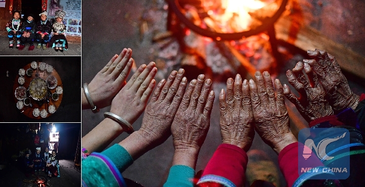 Combo photo shows hands of women of four generations (R) and the four women at home in Wuying Village, a village of Miao ethnic group under joint administration of Rongshui County, south China's Guangxi Zhuang Autonomous Region, and Congjiang County, southwest China's Guizhou Province, Jan. 13, 2018. (Xinhua/Huang Xiaobang)