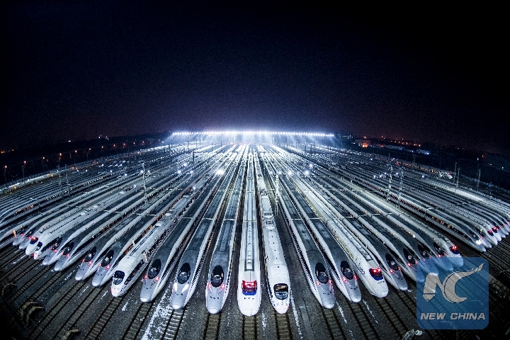 Photo taken on Feb. 1, 2018 shows bullet trains waiting to be maintained in Wuhan, central China's Hubei Province. (Xinhua/Xiao Yijiu)