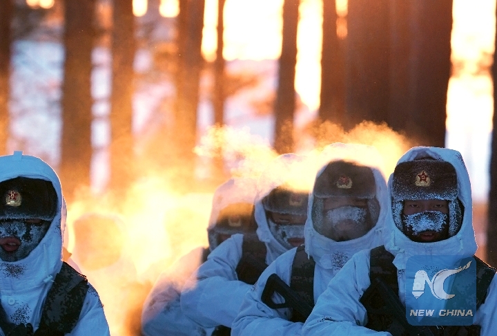 Soldiers take part in a training in Beiji Village of the border county Mohe, northeast China's Heilongjiang Province, Feb. 5, 2018. Soldiers stuck to their post at the border in spite of the severe cold in Mohe where the temperature had dropped to minus 40 degrees Celsius. (Xinhua/Li Gang)
