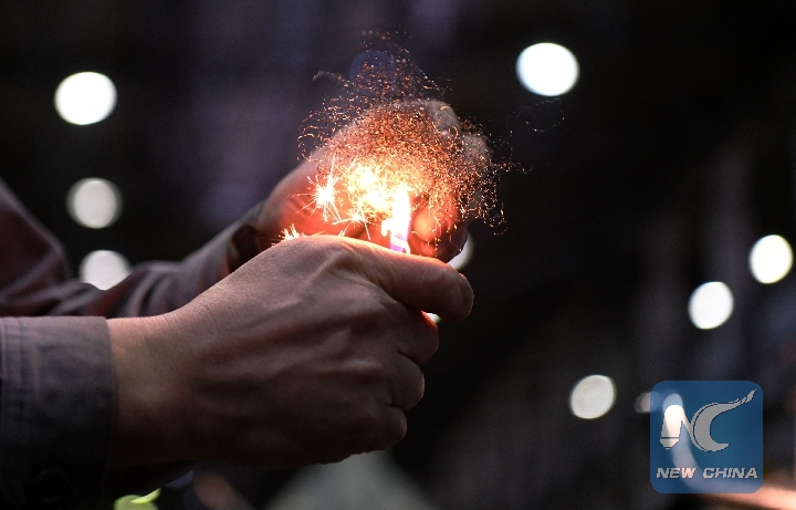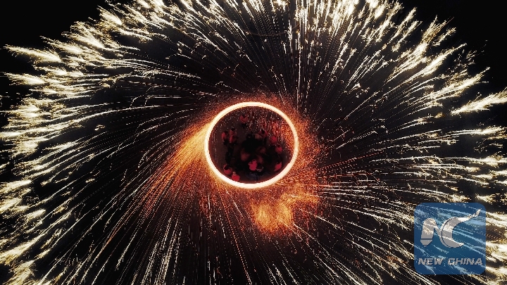 Sparks pour down as performers spray burning iron chips to shower sparks-like fireworks in Luanping County, north China's Hebei Province, March 1, 2018.(Xinhua/Wang Liqun)