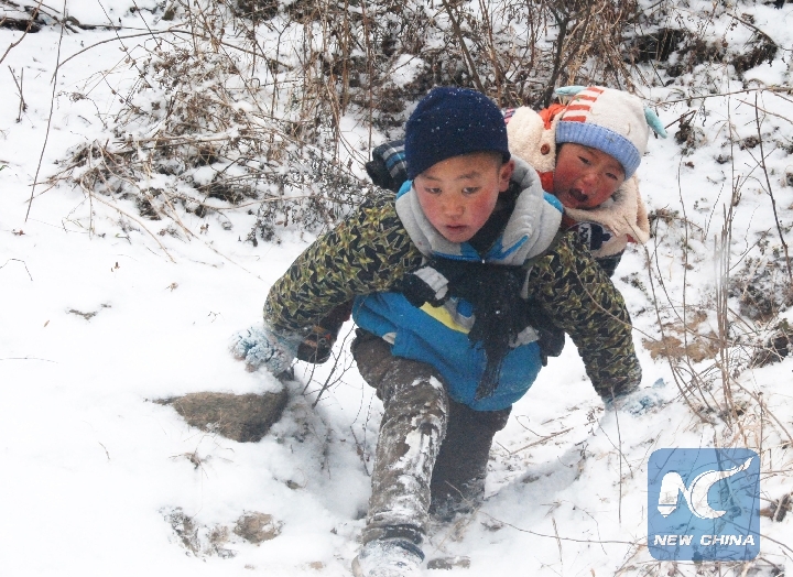Jijue Jizhu goes downhill with his younger brother on his shoulder, to take the bus heading to his grandpa's new dwelling in Yuexi County of Liangshan Yi Autonomous Prefecture, southwest China's Sichuan Province, Feb. 2, 2018. Jijue Jizhu, 9, carrying his little brother on the back, walks on a rugged path in heavy snow in the remote Daliang Mountains, to help his family move to grandpa's new dwelling. With the help of government's poverty relief policy, Jijue Jizhu's family and his grandpa are relocated to more liveable villages. Jijue Jizhu's family has got a government subsidy to build a new house in the New Dabu Village, where Jijue Jizhu could start his new semester. Since the new house is not done yet, the family decided to first move to the new dwelling of Jijue Jizhu's grandpa in the New Shaku Village, which is close to the New Dabu Village. Jijue Jizhu's family is expected to move into their new house by the end of 2018. (Xinhua/Tian Jianchuan)