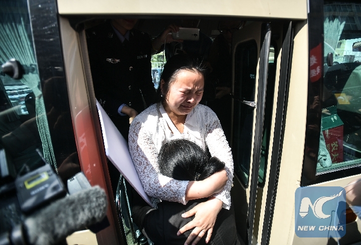Kang Ying (in white shirt) cries as hugging her mother Liu Dengying after their reunion in Chengdu, capital of southwest China's Sichuan Province, April 3, 2018. A toddler who disappeared from her parent's fruit stall in southwest China's Chengdu 24 years ago was reunited with her family, after a tireless search by her father. Wang Mingqing, 50, and his wife Liu Dengying have been ceaselessly searching for their daughter Qifeng since she disappeared one afternoon in 1994. Qifeng now bears the name of Kang Ying and lives in the northeastern province of Jilin with her husband, son and daughter. (Xinhua/Xue Yubin)