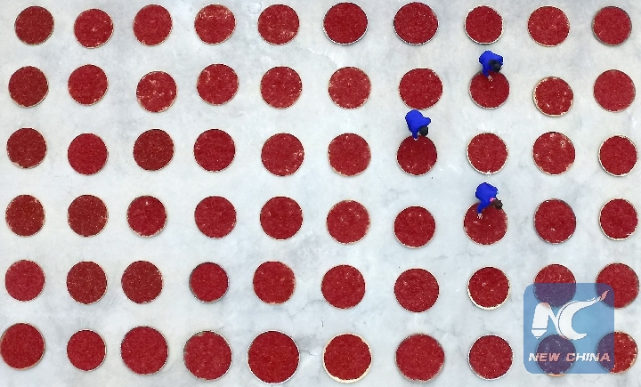 Aerial photo taken on April 25, 2018 shows Zou Daying together with employees drying chillies in her factory in Shangfu Town of Fengxin County, east China's Jiangxi Province. In 2013, 60-year-old Zou started up her business to produce condiments including chilli sauce following her retirement from a community. Over one million bottles of condiments were sold in 2017. Zou employed impoverished villagers in priority in her company and also set up a chilli growing cooperative to help them get ride of poverty. (Xinhua/Wan Xiang)