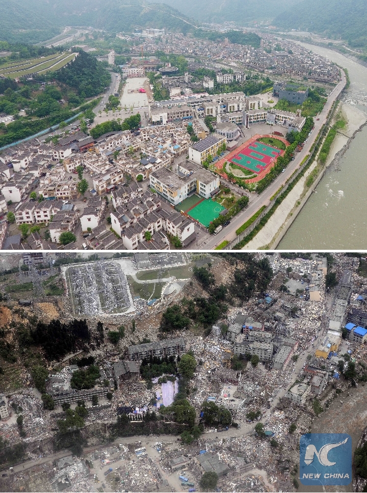 Combo photo shows an aerial view of the reconstructed Yingxiu Town of Wenchuan County, southwest China's Sichuan Province, May 5, 2018 (upper) and the quake-stricken Yingxiu Town on May 14, 2008. A decade ago, a devastating 8.0 magnitude earthquake rocked southwest China's Sichuan Province, severely ruining many counties such as Wenchuan and Beichuan. After ten years of reconstruction and development, those quake-stricken areas have now taken on a new look.(Xinhua/Liu Kun and Chen Kai)