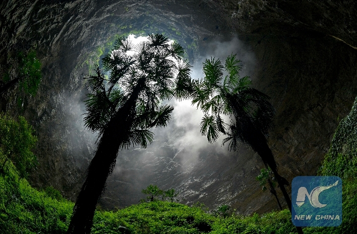 Photo taken on May 17, 2018 shows plants growing at the bottom of a giant karst sinkhole, also known as tiankeng, in Luoquanyan Village of Xuan'en County, central China's Hubei Province. (Xinhua/Song Wen)