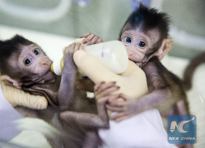 Two cloned macaques named Zhong Zhong and Hua Hua are fed at the non-human-primate research facility under the Chinese Academy of Sciences, Jan. 22, 2018. (Xinhua/Jin Liwang)