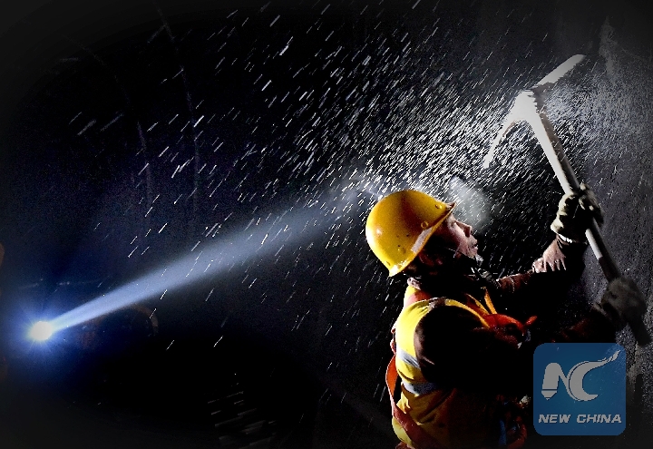 A member of a deicing team works at Guanyintang Tunnel in Sanmenxia City, central China's Henan Province, Jan. 25, 2018. The team's work is removing ice hanging on the wall of the tunnel to ensure railway transportation safety in winter. (Xinhua/Li An)