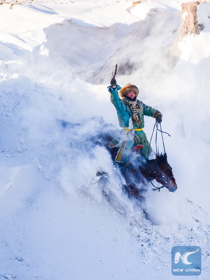 A herdsman rides a horse on the snow-covered grassland in Xilinhot city, north China's Inner Mongolia Autonomous Region, Jan. 18, 2018. (Xinhua/Lian Zhen)