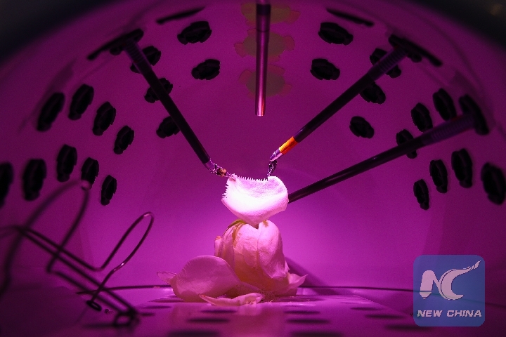 Flower petals are cut by da Vinci Xi Surgical System during a demonstration at the Medical Equipment & Health Care Products area of the first China International Import Expo (CIIE) in Shanghai, east China, Nov. 8, 2018. (Xinhua/Liu Dawei)