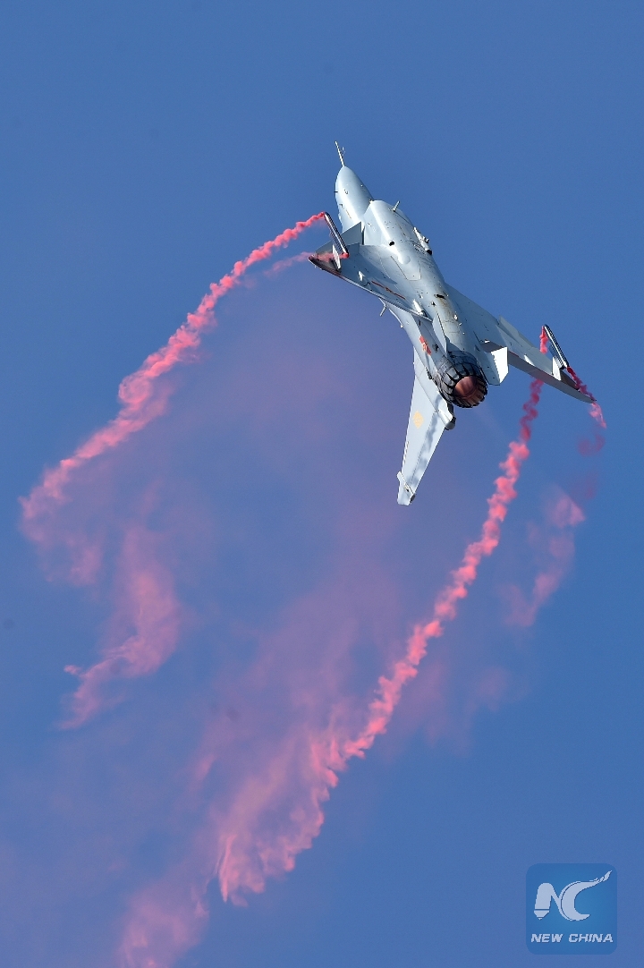 A J-10B fighter jet performs an aerobatics display during the 12th China International Aviation and Aerospace Exhibition (Airshow China) in Zhuhai, south China's Guangdong Province, on Nov. 6, 2018. A J-10B thrust-vectoring demonstrator made its debut at the Airshow China. (Xinhua/Liang Xu)