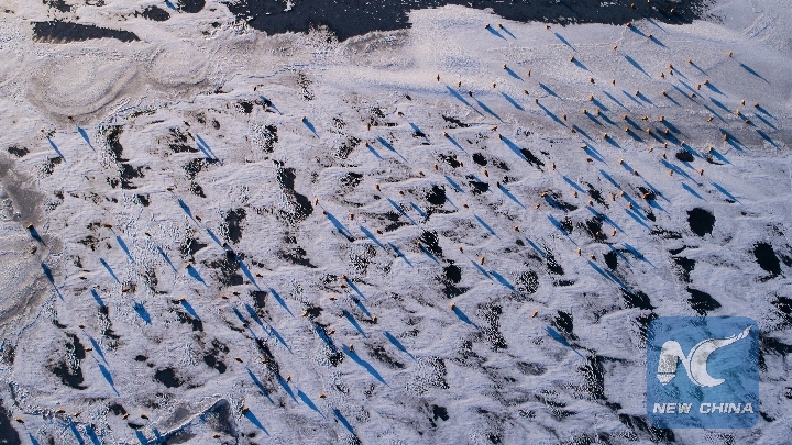 Aerial photo taken on Dec. 31, 2018 shows ruddy shelducks on the frozen Qinghai Lake in northwest China's Qinghai Province. (Xinhua/Wu Gang)