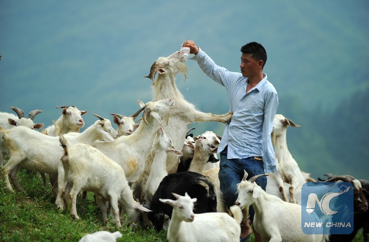 Yang Shengqiang feeds salt water to a goat at Sanhuixi Village of Tongren City, southwest China's Guizhou Province, May 17, 2018. Yang lost his left arm due to an accident at the age of 10. He began to make use of the natural pasture to breed goats in 2008, and after ten years of hard work, Yang's goat farm saw booming development. (Xinhua/Yang Wenbin)