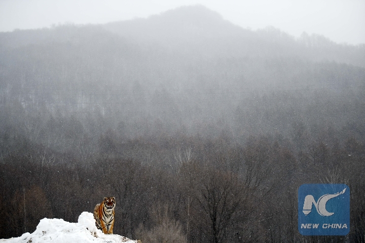A Siberian tiger stands in the snow at the China Hengdaohezi Feline Breeding Center in Hailin City, northeast China's Heilongjiang Province, Nov. 22, 2018.(Xinhua/Wang Jianwei)