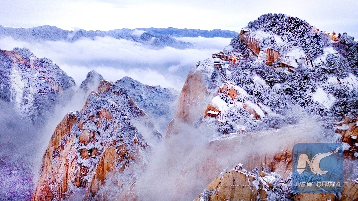 Aerial photo taken on Nov. 17, 2018 shows the snow scenery of the Mount Huashan scenic area in northwest China's Shaanxi Province. Mount Huashan is one of China's five most famous scenic mountains and is known for its steep and perilous peaks. (Xinhua/Tao Ming)