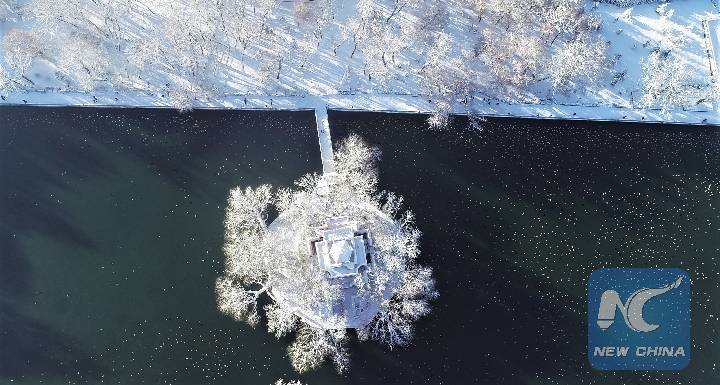 Aerial photo shows the view of a snow-covered park in Lhasa, capital of southwest China's Tibet Autonomous Region, Dec. 19, 2018. (Xinhua/Purbu Zhaxi)