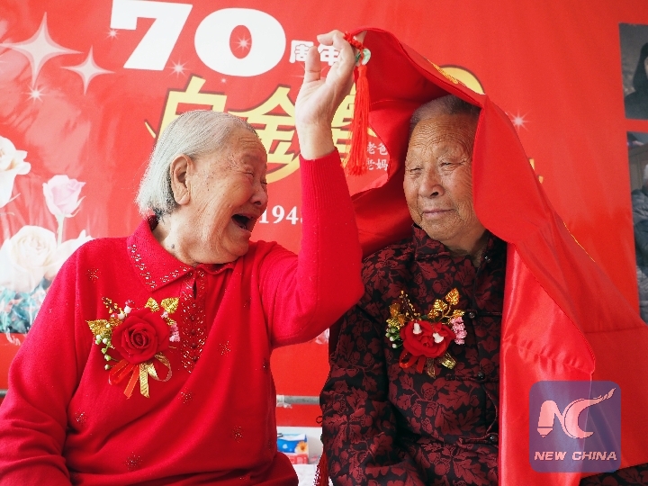 Sun Jinluan (L) lifts the red veil for her husband Chen Jianglin at the ceremony to celebrate their 70th wedding anniversary at Xixiaowang Township of Wudi County, east China's Shandong Province, Dec. 19, 2018. (Xinhua/Chen Ziqing)
