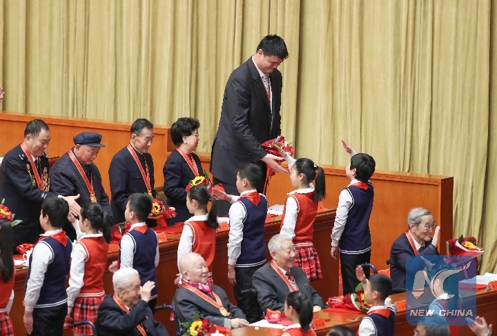 Yao Ming (top), president of the Chinese Basketball Association (CBA), accepts bouquets presented by young pioneers during a grand gathering to celebrate the 40th anniversary of China's reform and opening-up at the Great Hall of the People in Beijing, capital of China, Dec. 18, 2018. (Xinhua/Yin Gang)