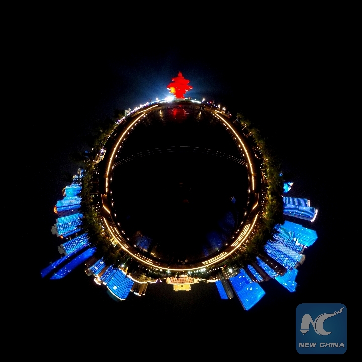 Panorama photo taken on June 2, 2018 shows the night view of Wusi Square in Qingdao, east China's Shandong Province. The 18th Shanghai Cooperation Organization (SCO) Summit was held from June 9 to 10 in Qingdao. (Xinhua/Yin Gang)