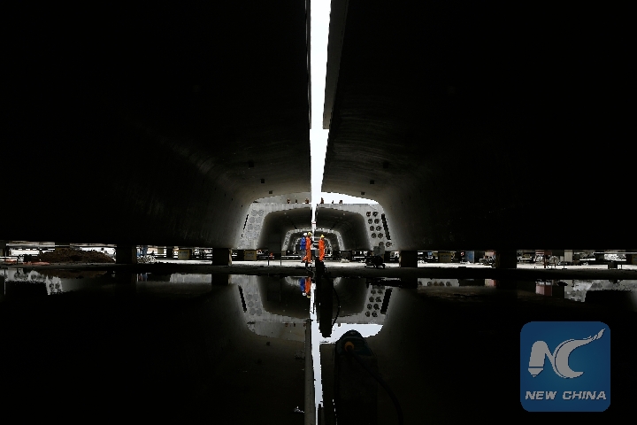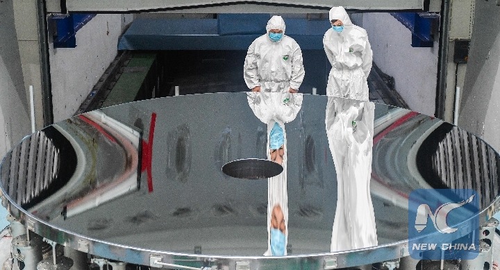 Researchers check the surface of a four-meter-aperture optical mirror developed by Changchun Institute of Optics, Fine Mechanics, and Physics of the Chinese Academy of Sciences in Changchun, northeast China's Jilin Province, Aug. 21, 2018. China has developed a high accuracy four-meter-aperture optical mirror, an important tool for deep space and astronomical observation. (Xinhua/Xu Chang)