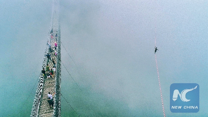 People watch a man walking on a webbing during a slacklining competition in the Shenxianju scenic spot in Xianju County, east China's Zhejiang Province, Aug. 25, 2018. (Xinhua/Zhu Cheng)