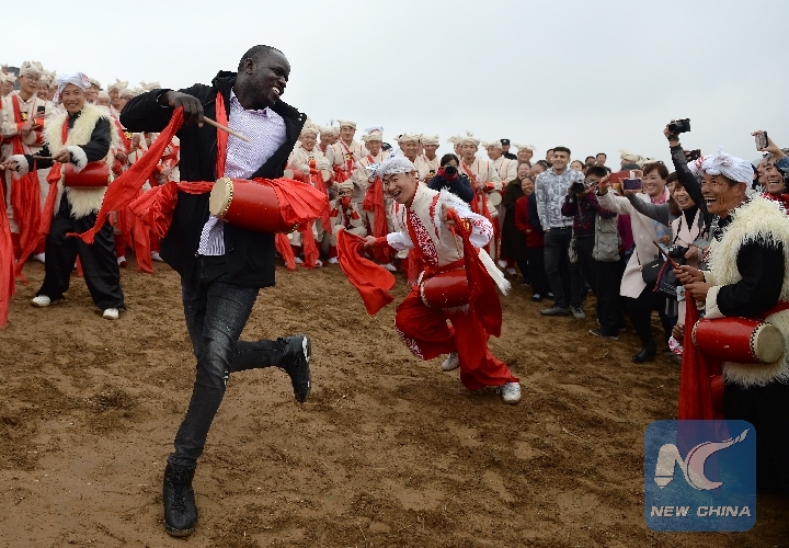 A foreigner performs Ansai waist drum dance with local dancers at Nangou Village in Ansai District, Yan'an City, northwest China's Shaanxi Province, Oct. 20, 2018. (Xinhua/Liu Xiao)