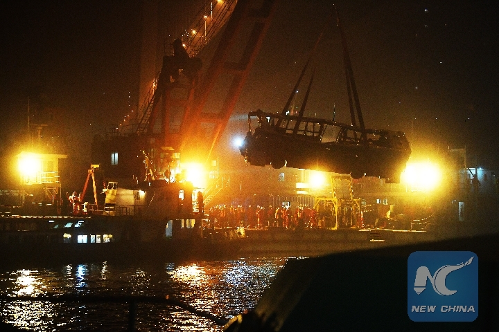 Rescuers salvage the wreck of a bus that plunged into the Yangtze River at Wanzhou, southwest China's Chongqing Municipality, Nov. 1, 2018. (Xinhua/Wang Quanchao)