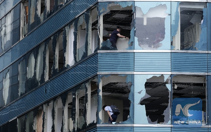 Staff members clean up offices ravaged by Super Typhoon Mangkhut in Kowloon of south China's Hong Kong, Sept. 17, 2018. (Xinhua/Wang Shen)