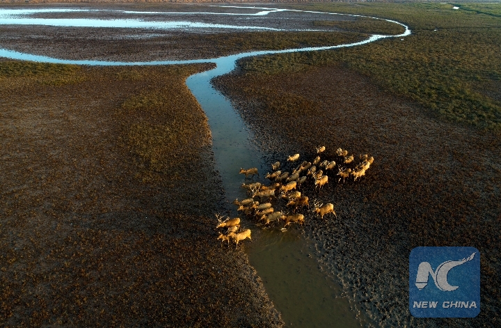 Aerial photo taken on Oct. 4, 2018 shows a herd of milu deer on a wetland at the Dafeng Milu National Nature Reserve in Yancheng City, east China's Jiangsu Province. (Xinhua/He Jinghua)