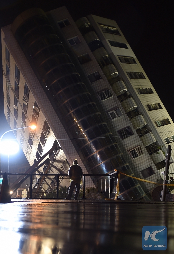 A citizen looks at the damaged Yun Men Tusi Ti building in quake-hit Hualien, southeast China's Taiwan, Feb. 8, 2018. (Xinhua/Yue Yuewei)