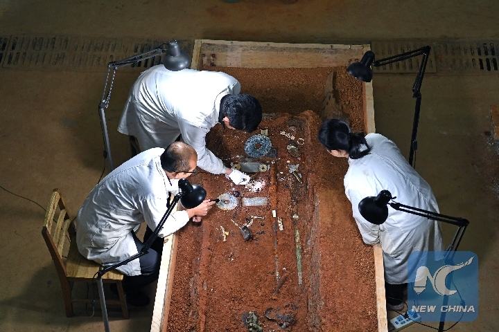 Archaeologists excavate the coffin of the No. 5 tomb of the Marquis of Haihun site in Nanchang, east China's Jiangxi Province, Jan. 25, 2018. A metal seal reading "Liu Chongguo" was unearthed from the No. 5 tomb at the Marquis of Haihun site, China's most complete Western Han Dynasty (206 B.C.- 25 A.D.) cemetery, and the identity of No. 5 tomb owner has been confirmed to be the eldest son of the controversial Chinese emperor Liu He. (Xinhua/Wan Xiang)