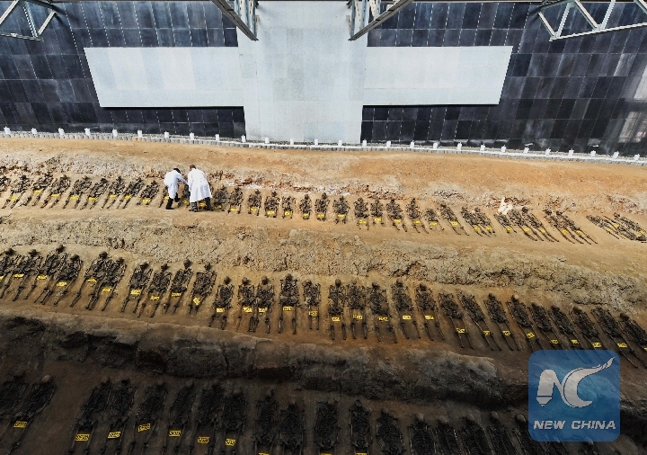 Liu Yulin (R) and his daughter Liu Hongying take care of the remains of miners at Liaoyuan Miner's Tomb Museum during Japanese occupation in Liaoyuan, northeast China's Jilin Province, April 4, 2018. (Xinhua/Zhang Nan)