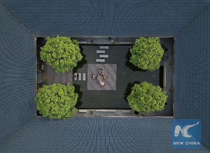 Aerial photo shows Liang Zhefeng (1st L), the owner of a guest house, serves tea for customers in Shangyu District of Shaoxing City, east China's Zhejiang Province, April 21, 2018. The local tourism had benefited from a project Zhejiang Province launched in 2003 to overhaul the living environment of villages. The province has made constant efforts in the past 15 years to improve the rural living environment, creating "tens of thousands of beautiful villages." (Xinhua/Weng Xinyang)