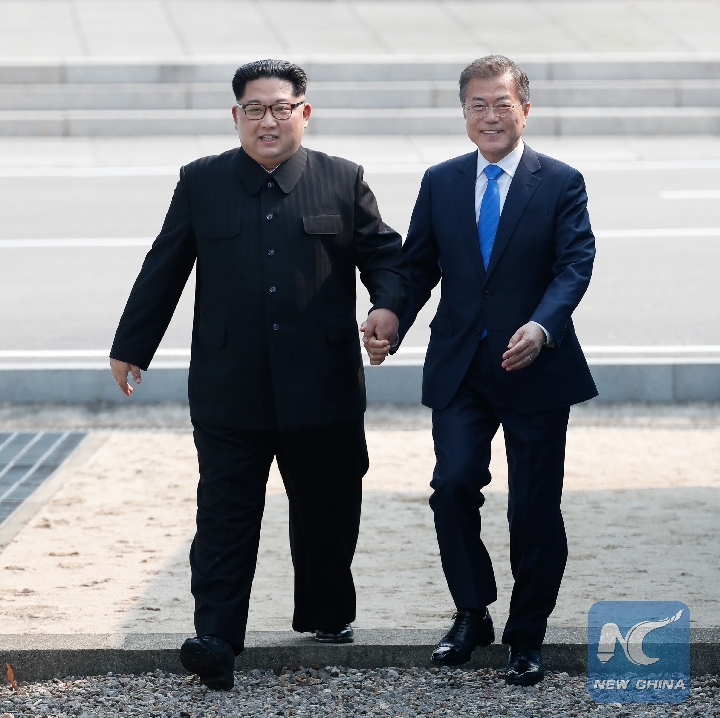 South Korean President Moon Jae-in (R) meets with top leader of the Democratic People's Republic of Korea (DPRK) Kim Jong Un in the border village of Panmunjom on April, 27, 2018. (Xinhua/Inter-Korean Summit Press Corps)