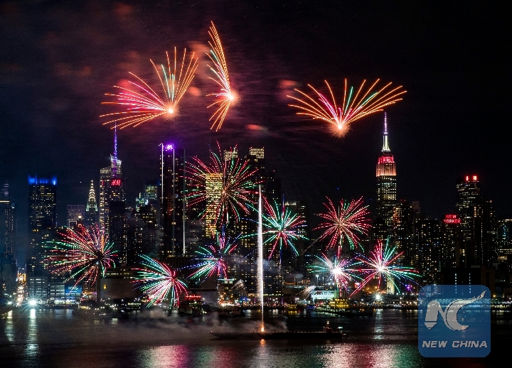Photo taken on Feb. 14, 2018 from Weehawken of New Jersey, the United States, shows the fireworks over Manhattan of New York City celebrating the Chinese Lunar New Year. (Xinhua/Wang Ying)
