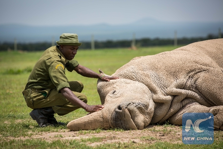 A caretaker touches Najin, one of the world's last two remaining female northern white rhinos, in Ol Pejeta Conservancy in Laikipia county, northern Kenya, March 30, 2018. (Xinhua/Lyu Shuai)