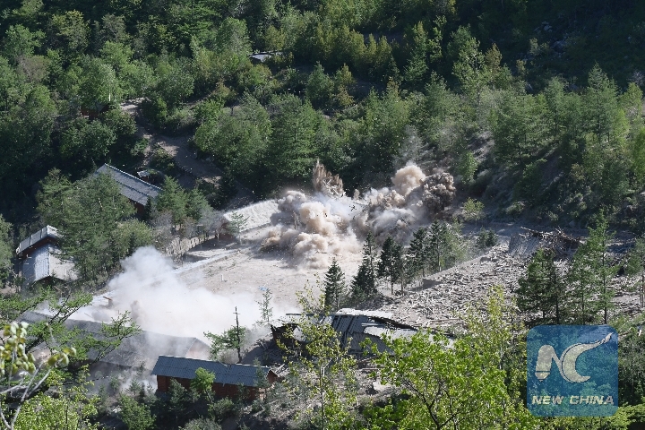 Photo taken on May 24, 2018 shows explosions at the nuclear test site of Punggye-ri, the Democratic People's Republic of Korea. The Democratic People's Republic of Korea confirmed the demolition of its nuclear test site at Punggye-ri on May 24. (Xinhua/Cheng Dayu)