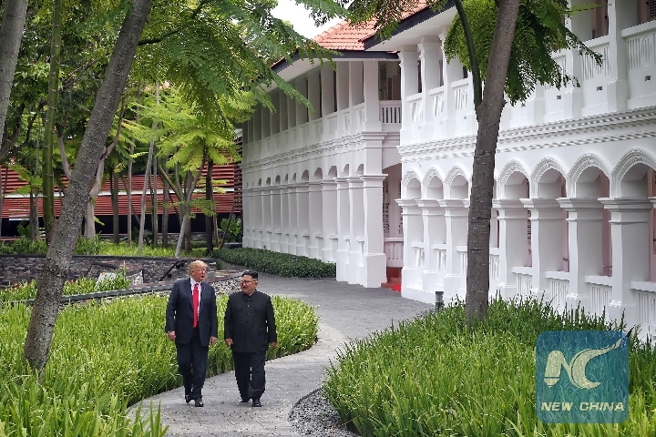 Top leader of the Democratic People's Republic of Korea (DPRK) Kim Jong Un (R) and U.S. President Donald Trump take a walk during their summit meeting in Singapore on June 12, 2018. (Xinhua/Ministry of Communication and Information of Singapore)