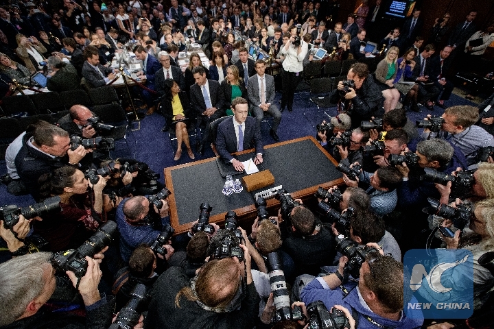 Facebook CEO Mark Zuckerberg (C) arrives to testify at a joint hearing of the Senate Judiciary and Commerce committees on Capitol Hill in Washington D.C., the United States, on April 10, 2018. (Xinhua/Shen Ting)