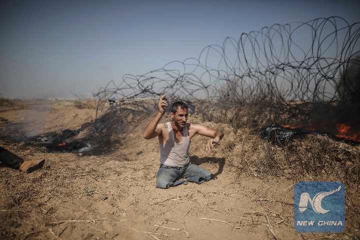 A disabled Palestinian protestor hurls stones during clashes with Israeli troops close to the border between the east Gaza Strip and Israel on May 11, 2018. (Xinhua/Wissam Nassar)