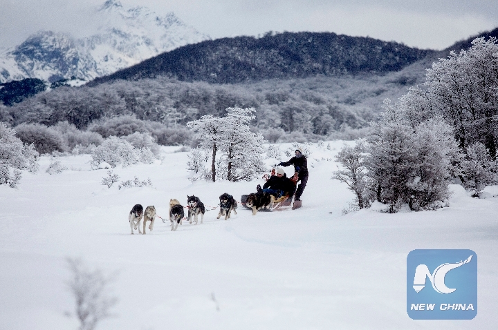 Tourists travel in a sledge pulled by dogs in the hatchery "Siberians of Fire" in Ushuaia, Tierra del Fuego Province, Argentina, July 8, 2018. (Xinhua/Martin Zabala)