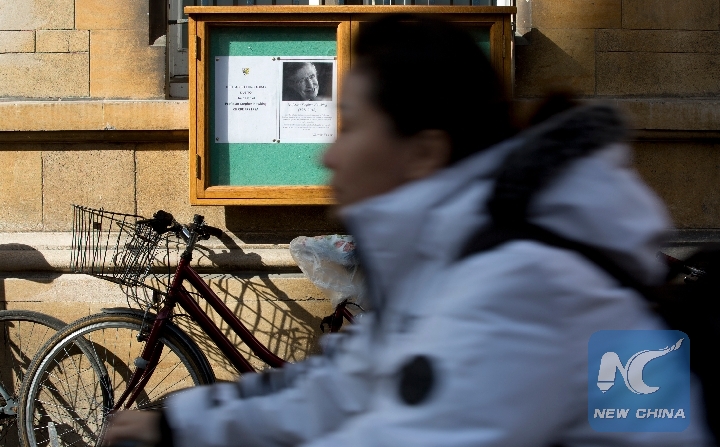 A notice announcing the death of Stephen Hawking is seen outside Gonville and Caius College at the University of Cambridge, in Cambridge, Britain, on March 14, 2018. (Xinhua/Isabel Infantes)