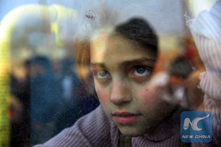 A girl looks out the window of a bus while evacuating the town of Hamouriyeh in Eastern Ghouta area of Damascus, Syria, March 15, 2018. (Xinhua/Ammar Safarjalani)