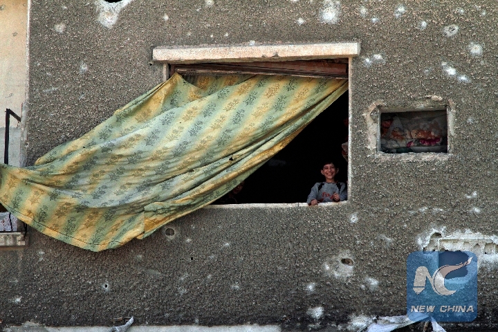 A Syrian boy looks out of the window in Douma district, east of the capital Damascus, Syria, on April 20, 2018. (Xinhua/Hummam Sheikh Ali)