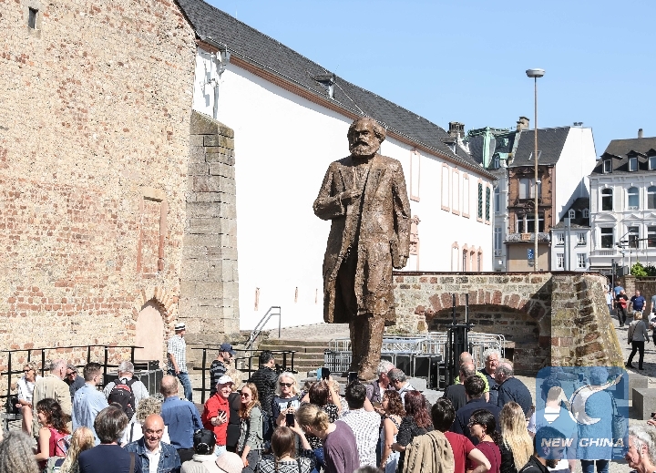Visitors gather in front of the Karl Marx statue in Trier, Germany, on May 5, 2018. A China-donated statue of German philosopher Karl Marx was unveiled on May 5 in his birth town on the 200th anniversary of his birth. (Xinhua/Shan Yuqi)