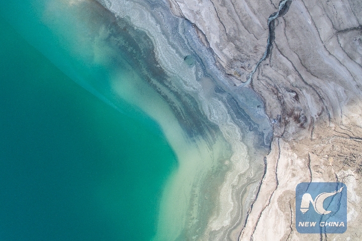 Picture taken in the West Bank on April 8, 2018 shows receded water of the Dead Sea. (Xinhua/Guo Yu)