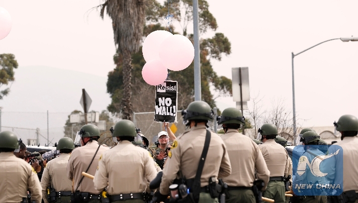 A man protests against border wall near the U.S.-Mexico border in San Diego, the United States, on March 13, 2018. (Xinhua/Li Ying)